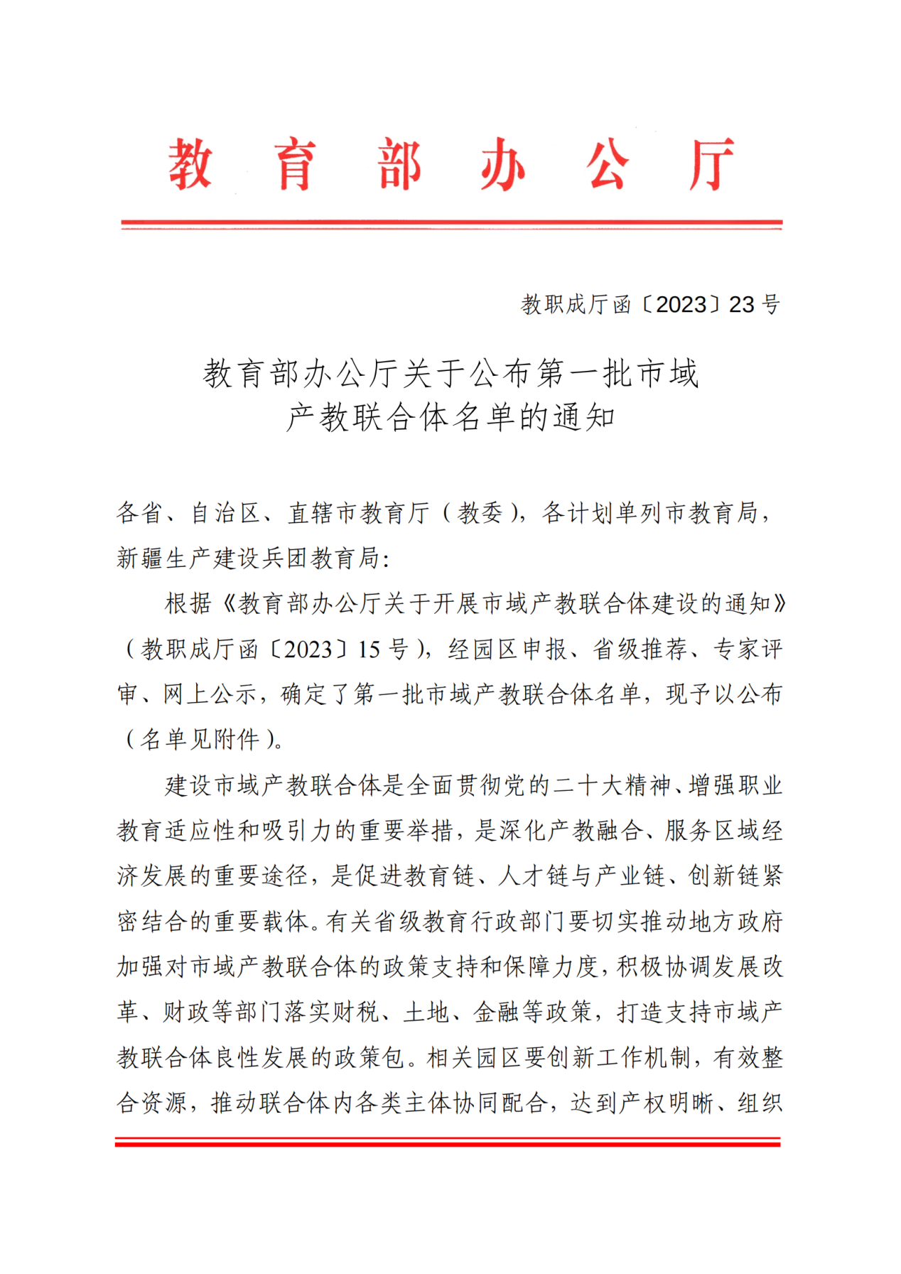 2022年12月,中共中央办公厅、国务院办公厅联合发布《关于深化现代职业教育体系建设改革的意见》,旨在推动“一体两翼”发展,探索省域现代职业教育新模式,打造市域产教联合体和行业产教融合共同体。2023年4月18日,教育部办公厅发布《关于开展市域产教联合体建设的通知》(教职成厅函〔2023〕15号),要以产业园区为基础,打造一批集人才培养、创新创业、促进产业经济高质量发展功能的市域产教联合体。