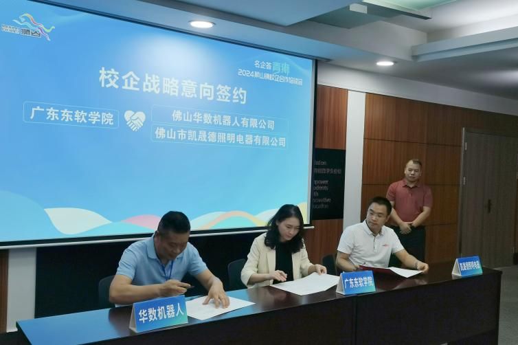 随后,会议进入到校企战略意向签约环节,计算机学院党总支副书记黄爱辉与佛山华数机器人有限公司、佛山市凯晟德照明电器有限公司两家企业的代表上台签约。两家企业成功与我校签订校企洽谈合作意向书,标志着我校将有更多的校企合作机会,激发更多产教融合新动能。