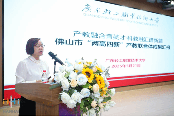 佛山市“两高四新”产教联合体牵头院校广东轻工职业技术大学应邀出席会议,科学技术部负责人李飞星在会上汇报了联合体运行成果。会议还进行了产教融合项目签约,举行了南海区中高本一体化人才共育联盟揭牌仪式。