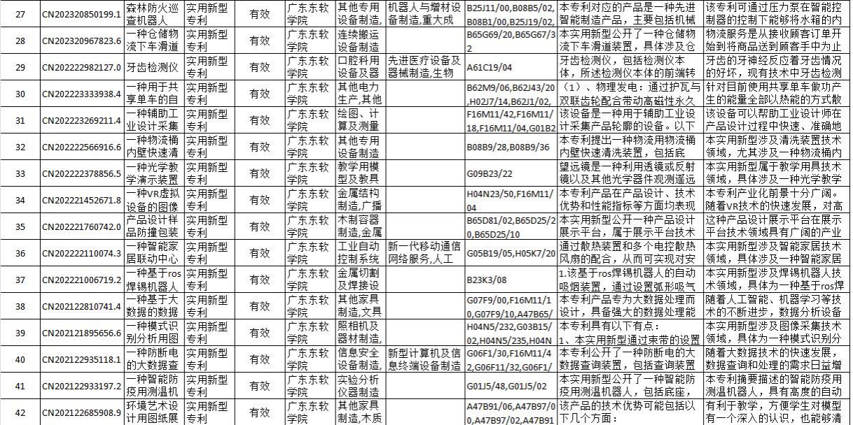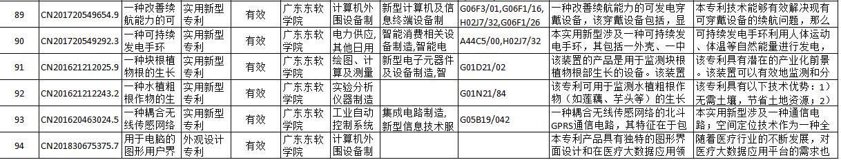 学校现有有效专利94件,其中发明专利17件,实用新型专利77件,有意向的可联系科研管理部,陈老师,0757-86684633。详细清单见附表《广东东软学院专利供给信息》。