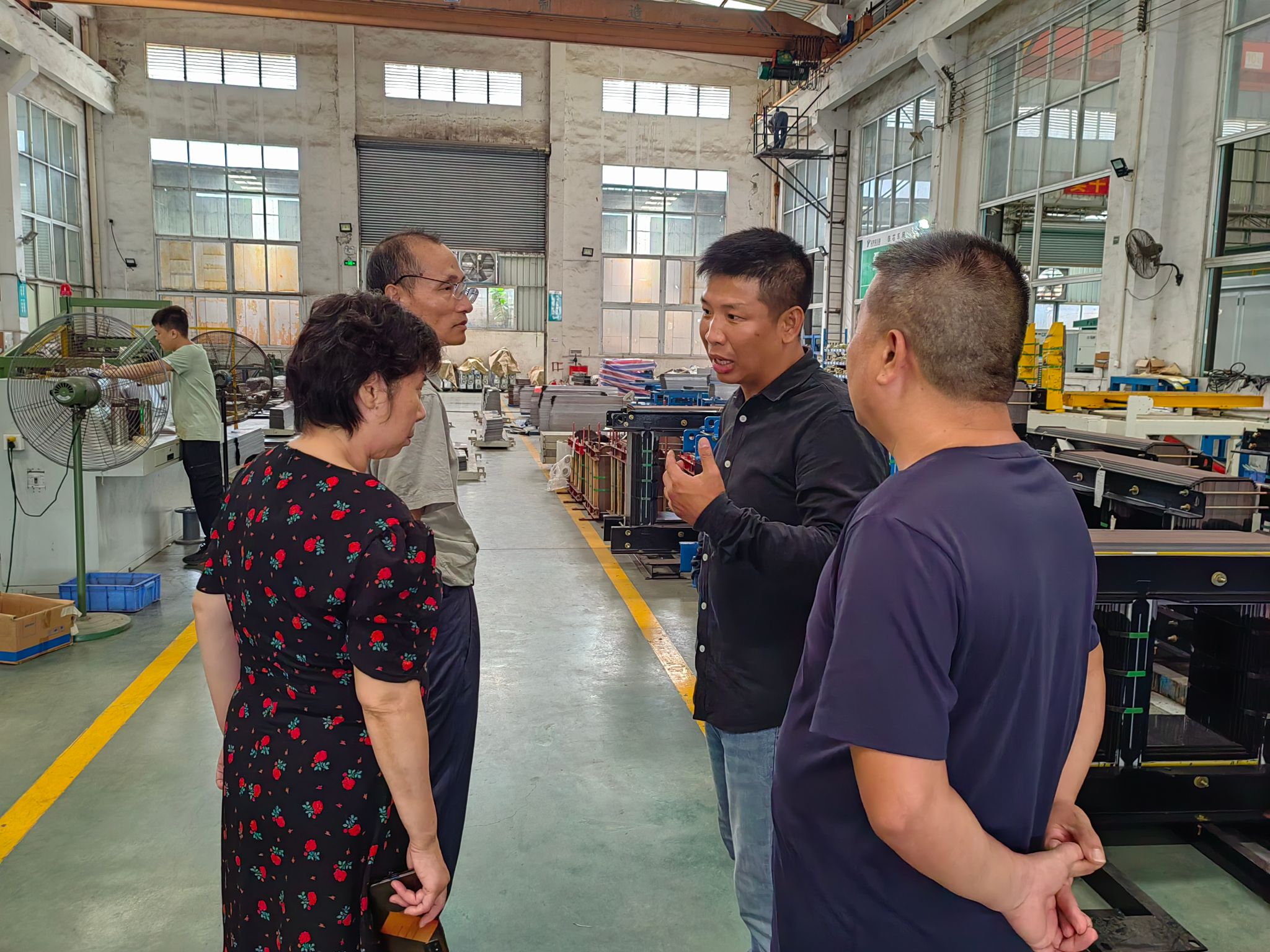 接着,赵永光董事长带领李文龙院长、彭四平副院长以及程美英老师一同参观了广东粤特电力集团有限公司的工厂,简单介绍其主营产品预装式变电站(欧式箱变)、组合式变电站(美式箱变)等以及企业文化。
